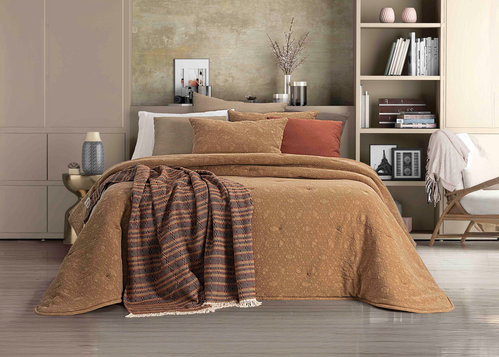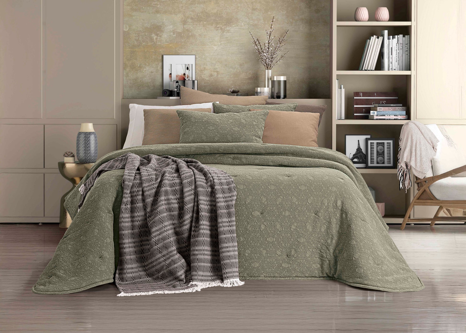 Disponível em dois tamanhos generosos, incluindo opção para cama King Size, e em cores sofisticadas — Camel e Verde — este edredão é a escolha ideal para quem procura um ambiente elegante, sereno e luxuoso.